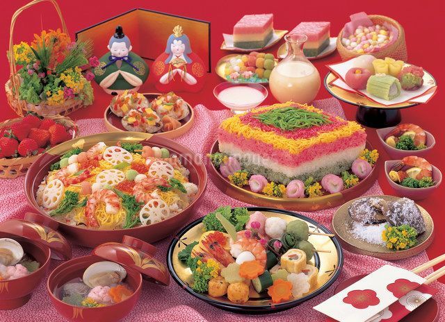 3月3日の桃の節句(ひな祭り)の日には縁起の良い食材がたっぷり使われたお祝い食の 「ちらし寿司」 が欠かせません。見た目が大変華やかな「ちらし寿司」は、3月の明るい気候にぴったりなご馳走でしょう。 ちらし寿司は、関東と関西では特徴を異にします。 関東では器に酢飯を入れ、その上にエビやマグロなどの寿司ネタをきれいに乗せます。通常一人前ずつ盛り付けてあります。デンバー界隈の日本食レストランでもこのタイプのちらし寿司をよく見ます。このタイプのちらし寿司は、古くは江戸時代の大奥でも祝い膳として親しまれていた記録があるそうです。 関西ではいわゆる五目寿司がちらし寿司と呼ばれることが多く、酢飯に具材を混ぜた後、錦糸卵や海苔の細切りがトッピングされています。 大皿に盛り付けて、皆で分けて食べるスタイルとなっています。